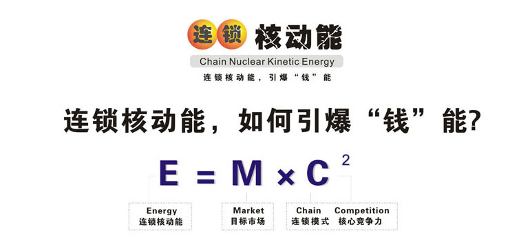 ,這是世界著名的愛因斯坦能量公式?;趷垡蛩固沟南鄬φ摵湍芰抗?,產生了原子彈和核電站,今天的人類太空實踐證實了愛因斯坦理論的正確性,人類因此發生了翻天覆地的變化。在愛因斯坦的能量公式中,M是質量,C是光速,當速度為光速時,即使很小的質量也能轉化為非常大的能量。 廣州采納企業管理顧問有限公司首席咨詢師陳宏創建的的連鎖核動能理論(全名:連鎖內核能量裂變激增理論)是以愛因斯坦的能量公式為基礎創建,但其含義和指向是不同的:M=目標市場(Market),C1=連鎖模式(Chain),C2 =核心競爭力(Competition),其理論意義是,企業找準了目標市場,以連鎖的方式經營,核心競爭力越大,推動其發展能量就越大。 連鎖核動能理論如何幫助連鎖企業“引爆錢能”快速發展?我們用深入淺出的圖形表達方式對該理論進行分層闡述: